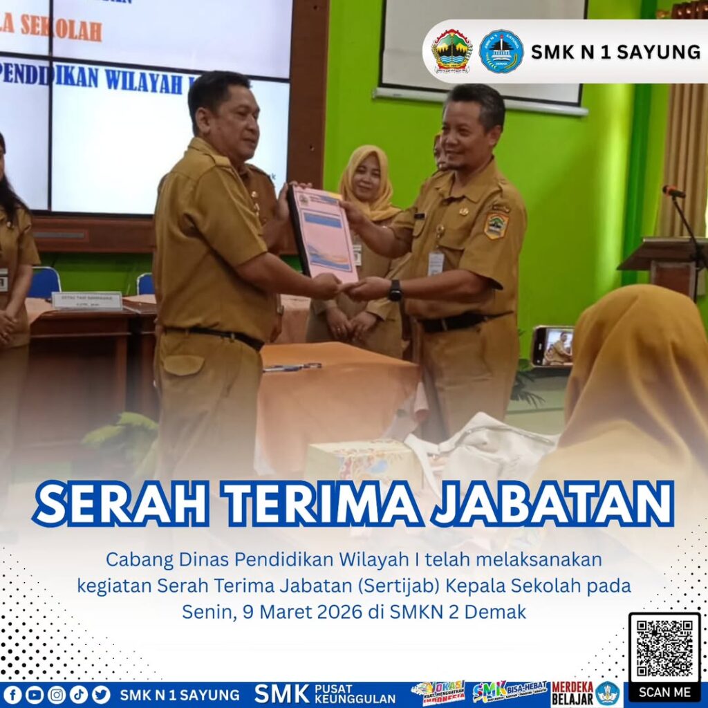 Pada kesempatan tersebut, Sertijab Kepala Sekolah SMK Negeri 1 Sayung menandai adanya perubahan penugasan kepala sekolah.